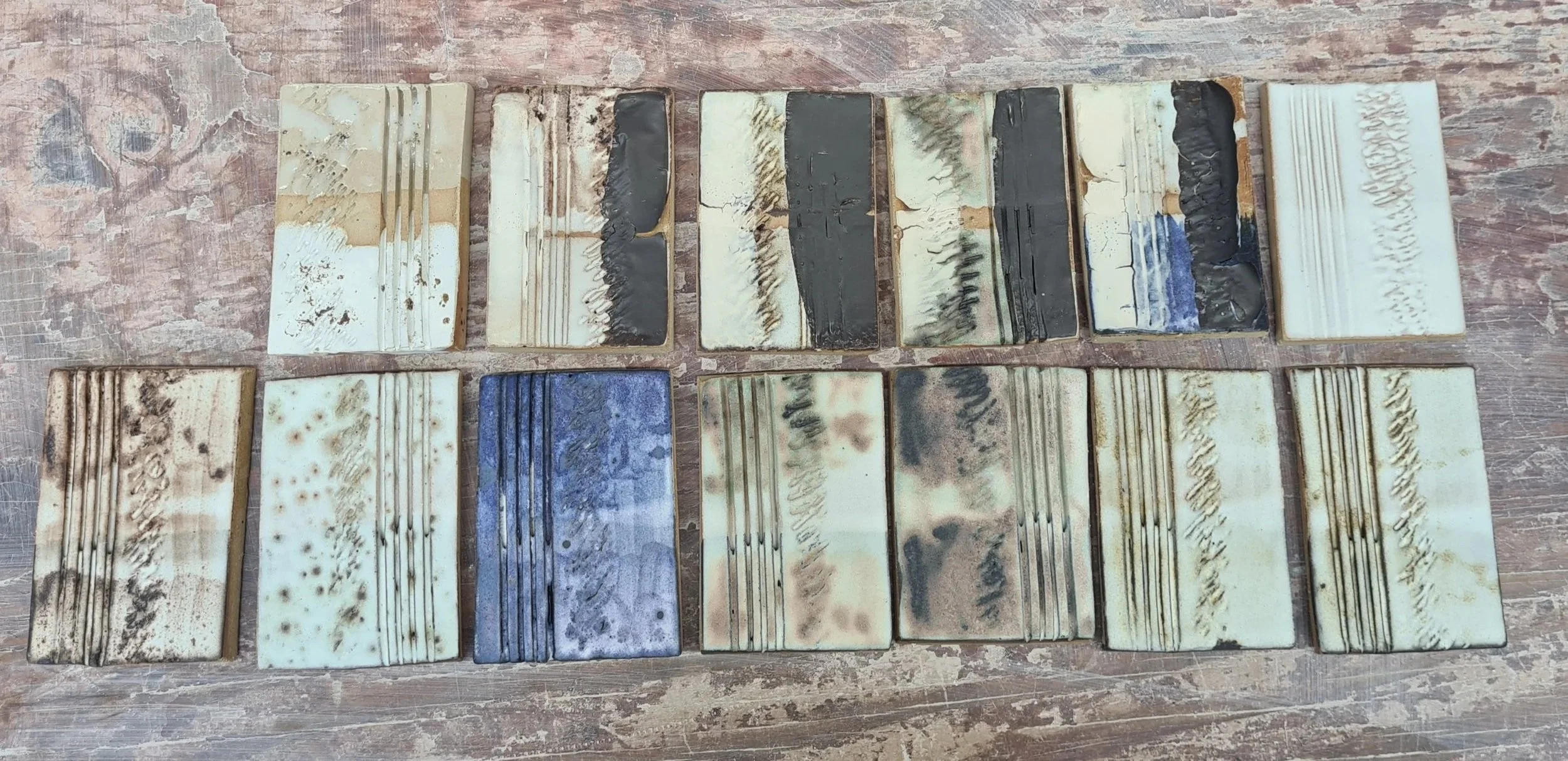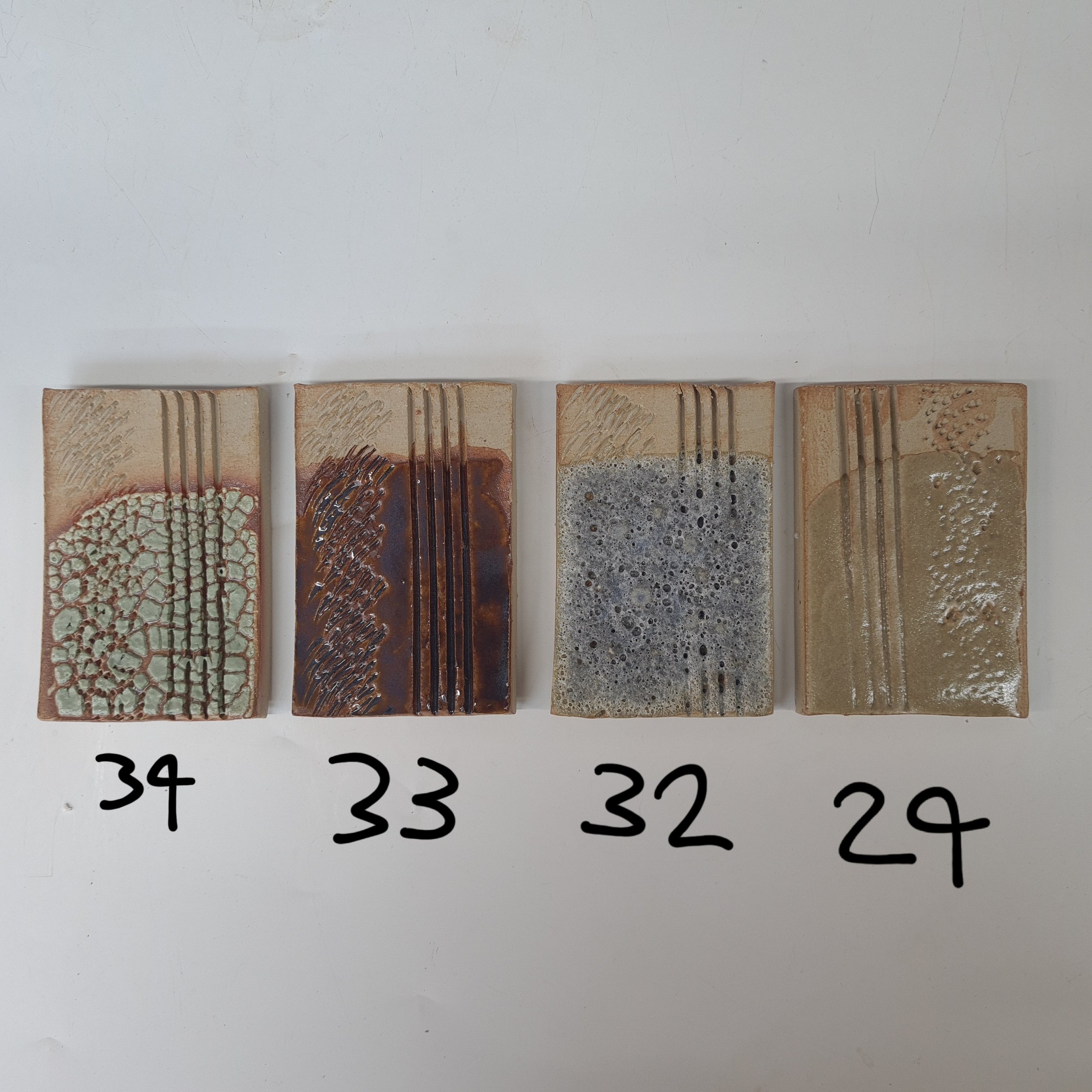 Therefore, I had a look through the book and decided created base glaze C was a good place to begin. Below are my test tiles using this base glaze, alongside a variation of oxides. Check out my Technical Page for a live working document of what I used exactly on these test tiles.