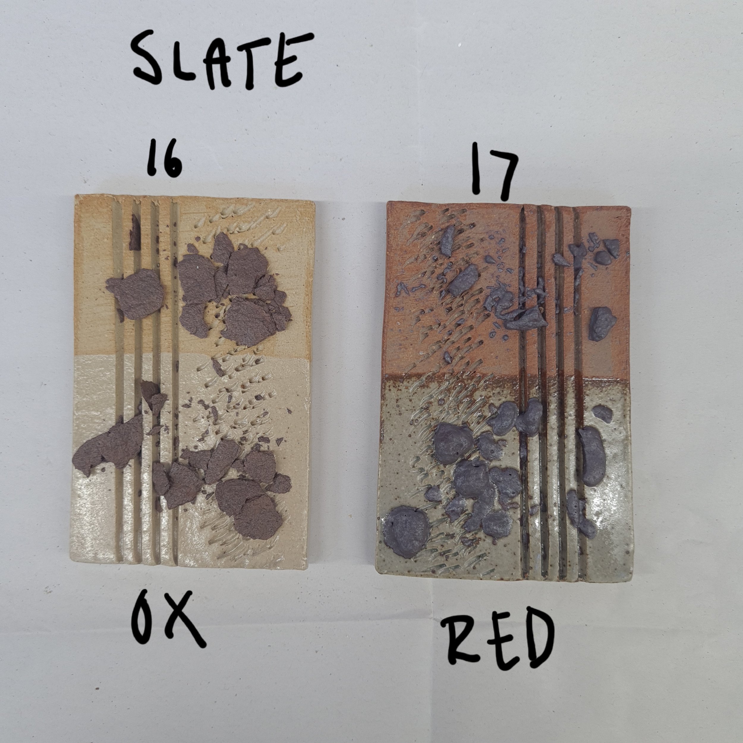 You can see the difference between the slate in the oxidation firing vs the reduction- it reached more of a melting point in the reduction and began to bubble, which is super fascinating!