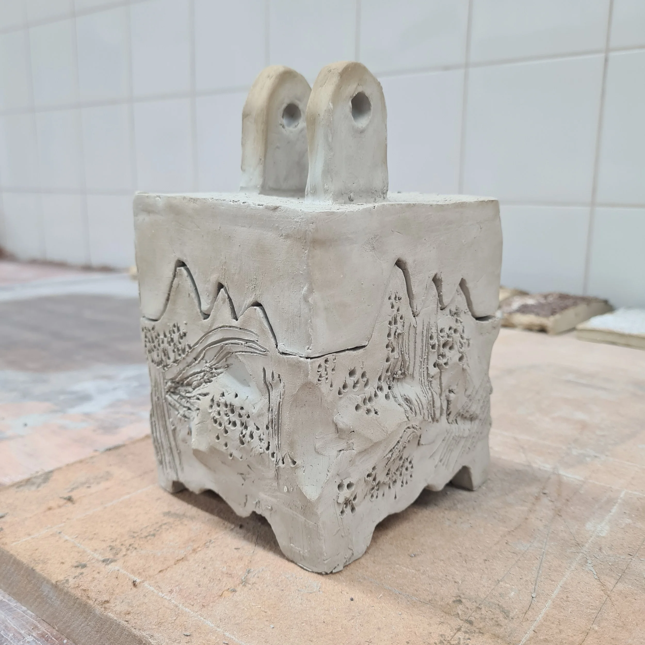 A carved out cube of clay transformed into a box- however this did not incorporate the slab building technique but it did allow me to explore less manufactured texture.