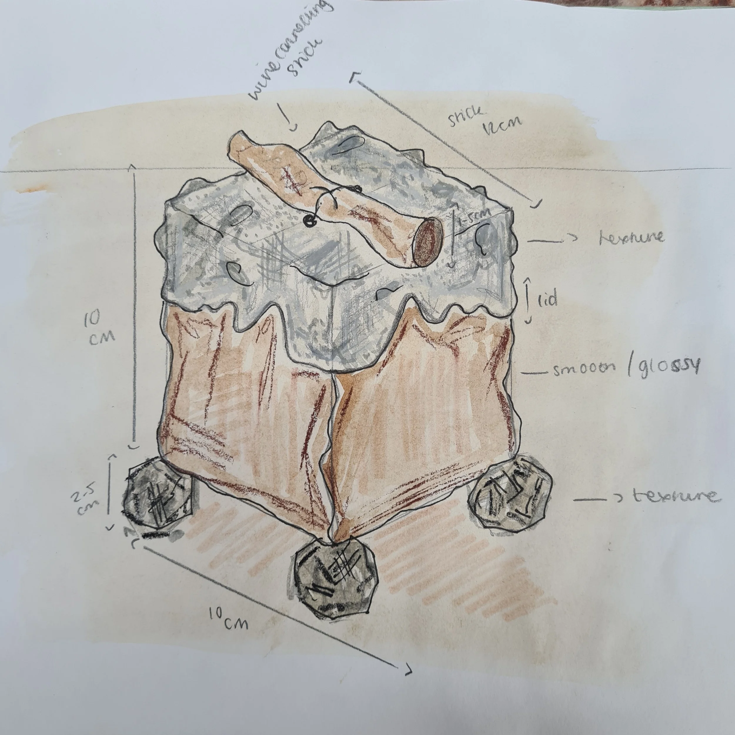 A quick maquette of what my sketched box could look like- soon realised I needed to change how I applied the texture.