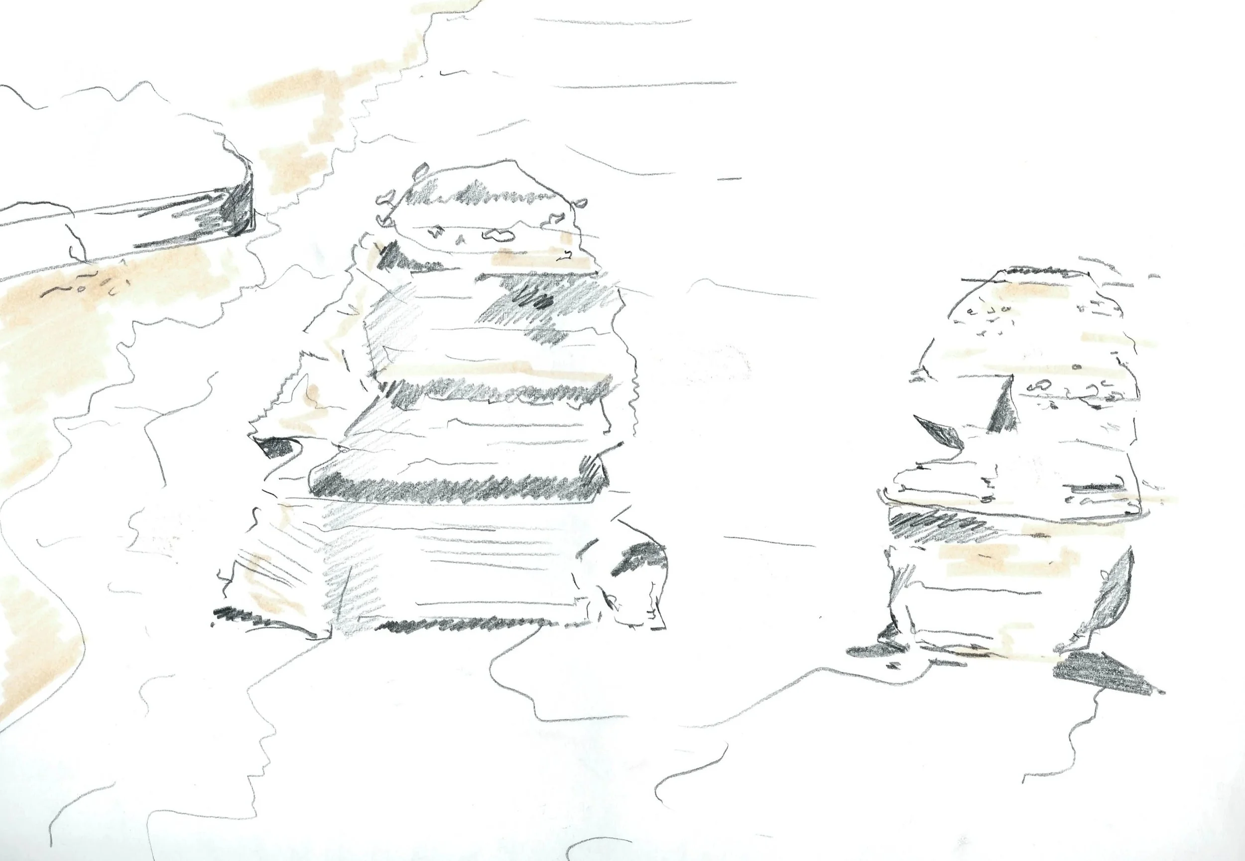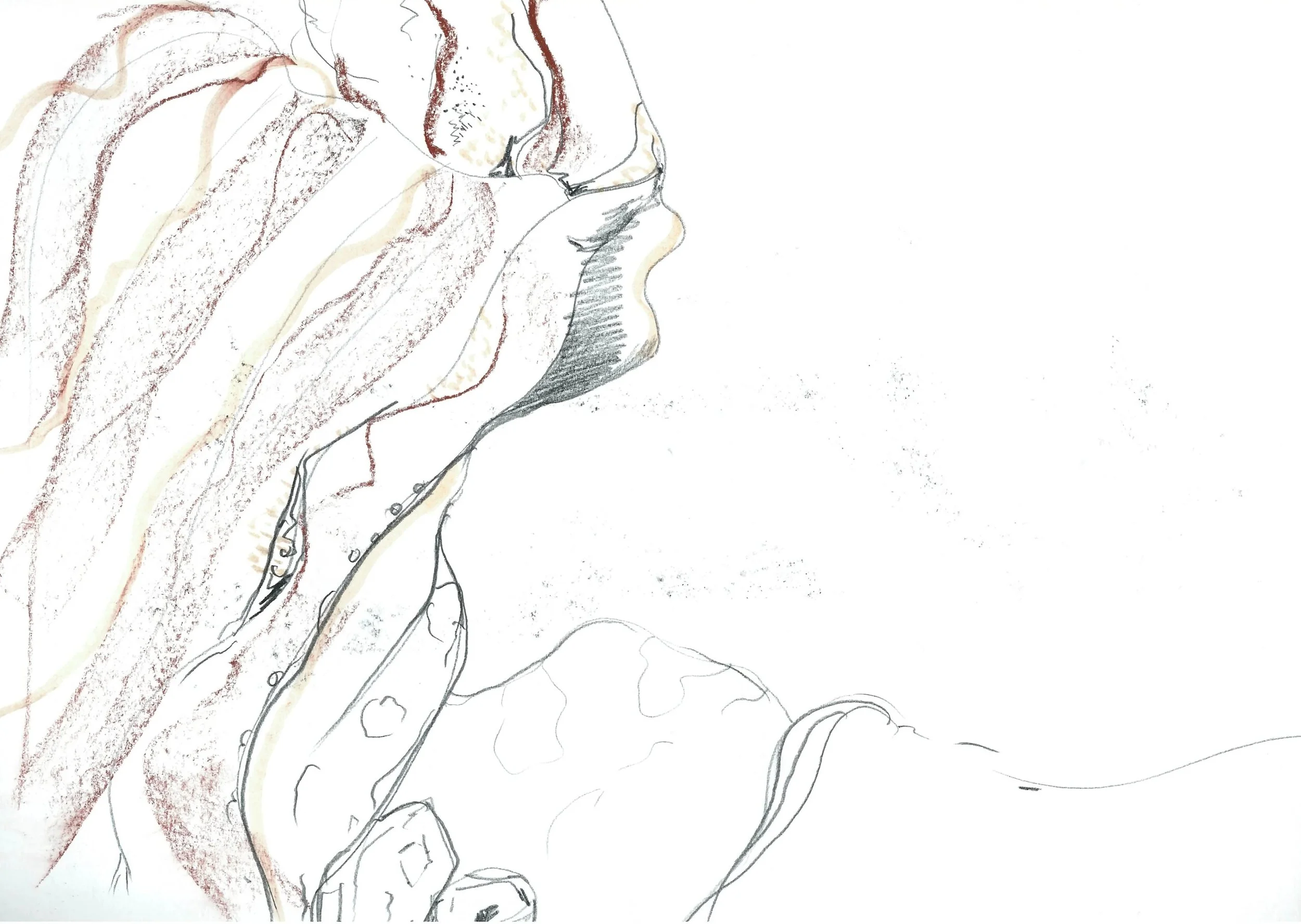 Through sketching, it helps me develop a way forward. It could be as simple as just drawing an outline or a singular section. I also like using charcoal, watercolour and brush pens to enhance darkness & shadows as I feel clay sculpture thrives when there’s textural depth.