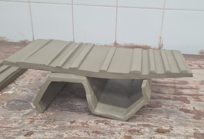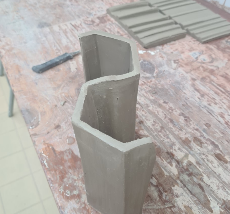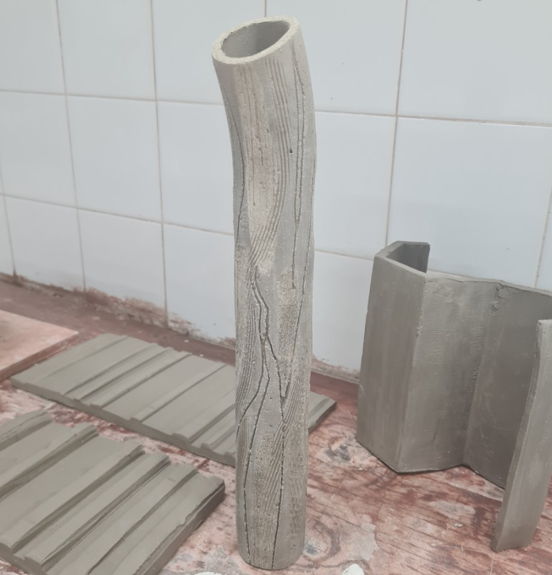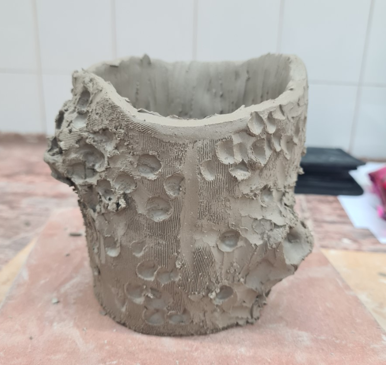Therefore, when we extruded the hexagon shape, I was inspired by this man-made influenced form. When it was leather-hard, I sliced the extrusion down the middle and reattached the halves in an alternate pattern. I thought this would create a great stand for my platter to sit on (as we also had to create two stands for our platters). This influenced me to carry on trialing out some ideas for this project. I began coiling some pots and adding some prominent moss inspired textures on the outside of the vessel. This was inspired by last weeks practical session.