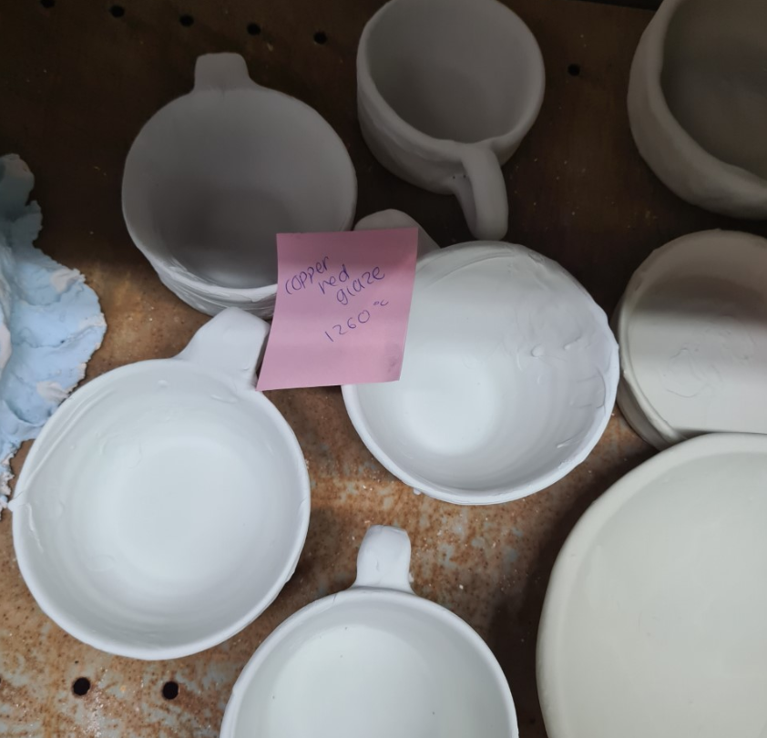 I coated the mugs in a copper red glaze once fired- they were fired to stoneware temp