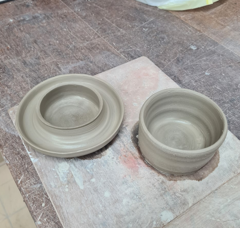 I created a pinch pot plate and a pinch pot bowl and then added a base on both- almost creating a set of three with the former bowl.