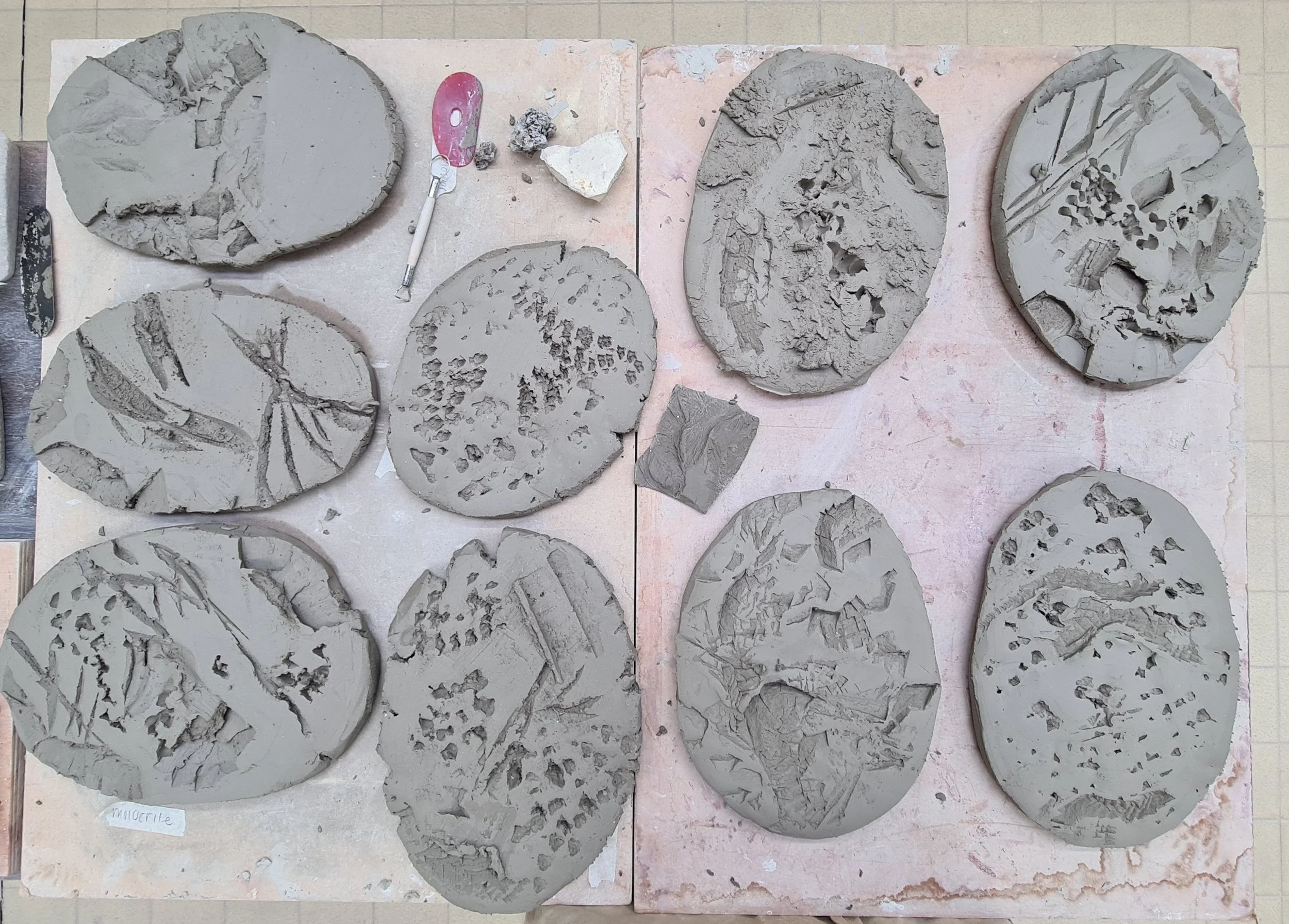 Texture tiles all labelled and drying- with the application of terracotta and black slip and added elements. Mainly grog- but I applied granular feldspar into a slip too and sprinkled molocrite over the top of the slip.