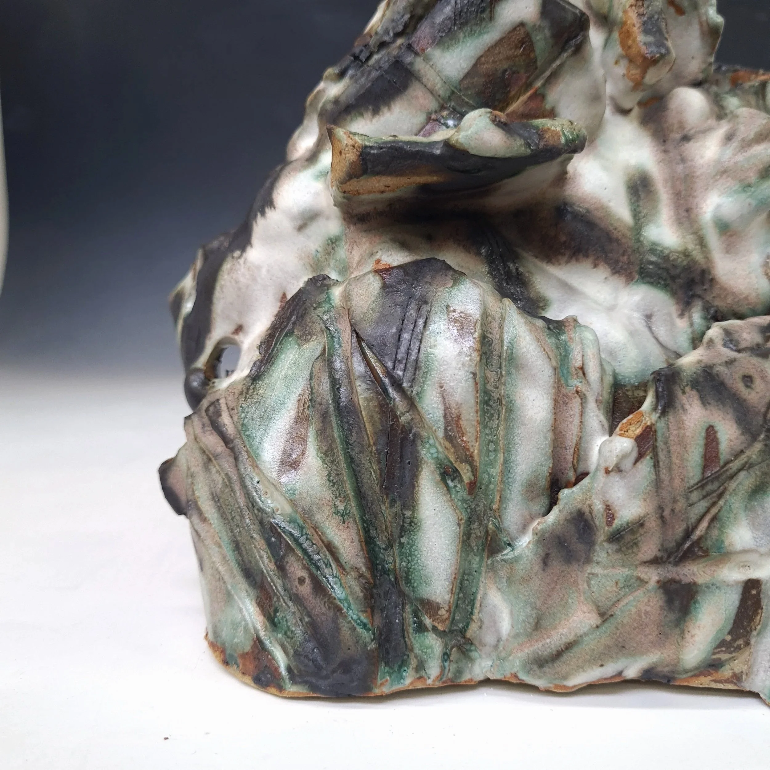 This has copper carb oxide and the base glaze C in an oxidation firing- the base glaze maintains the chalky whiteness as it’s not been fired at the desired temperature but adds a nice contrast between the oxide and the base glaze.