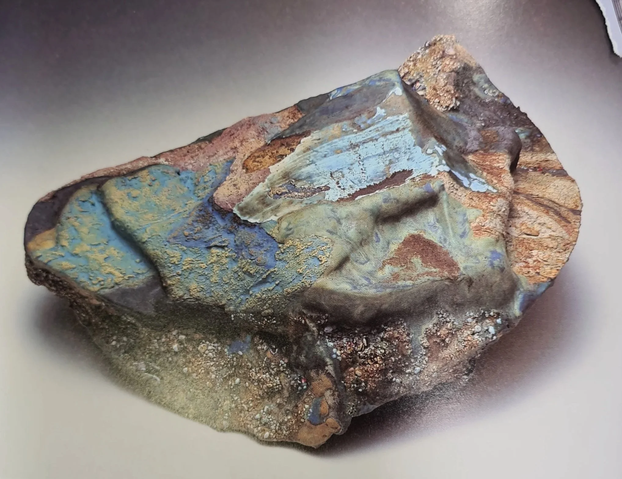 ‘Plate movement’ - Direct rock impressed slab with fused indigenous materials. High-fired in oxidation. Beach sands, minerals and river mud were layered with texture and coloured slips and glazes. 1240’c firing. Pg- 178